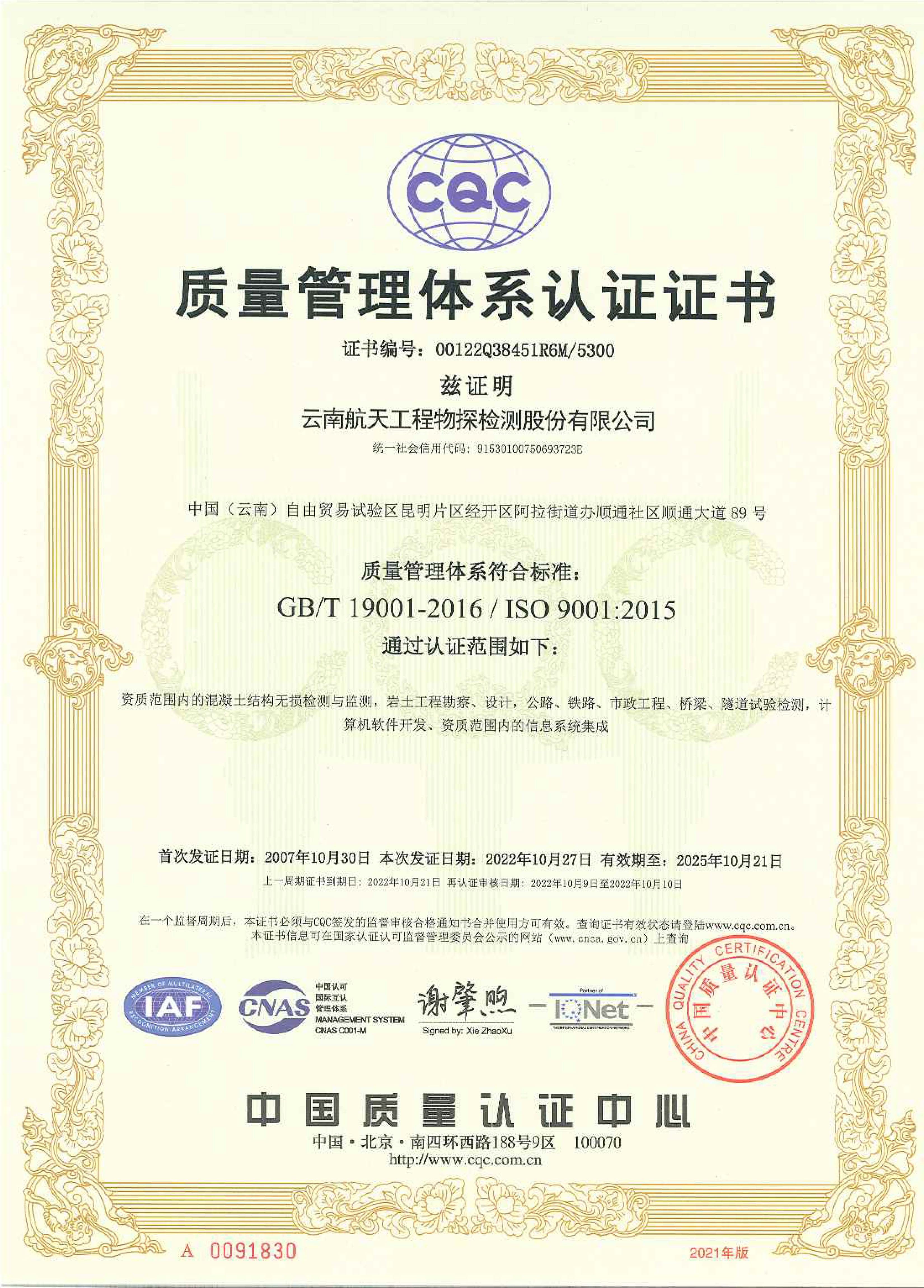 质量管理体系认证证书