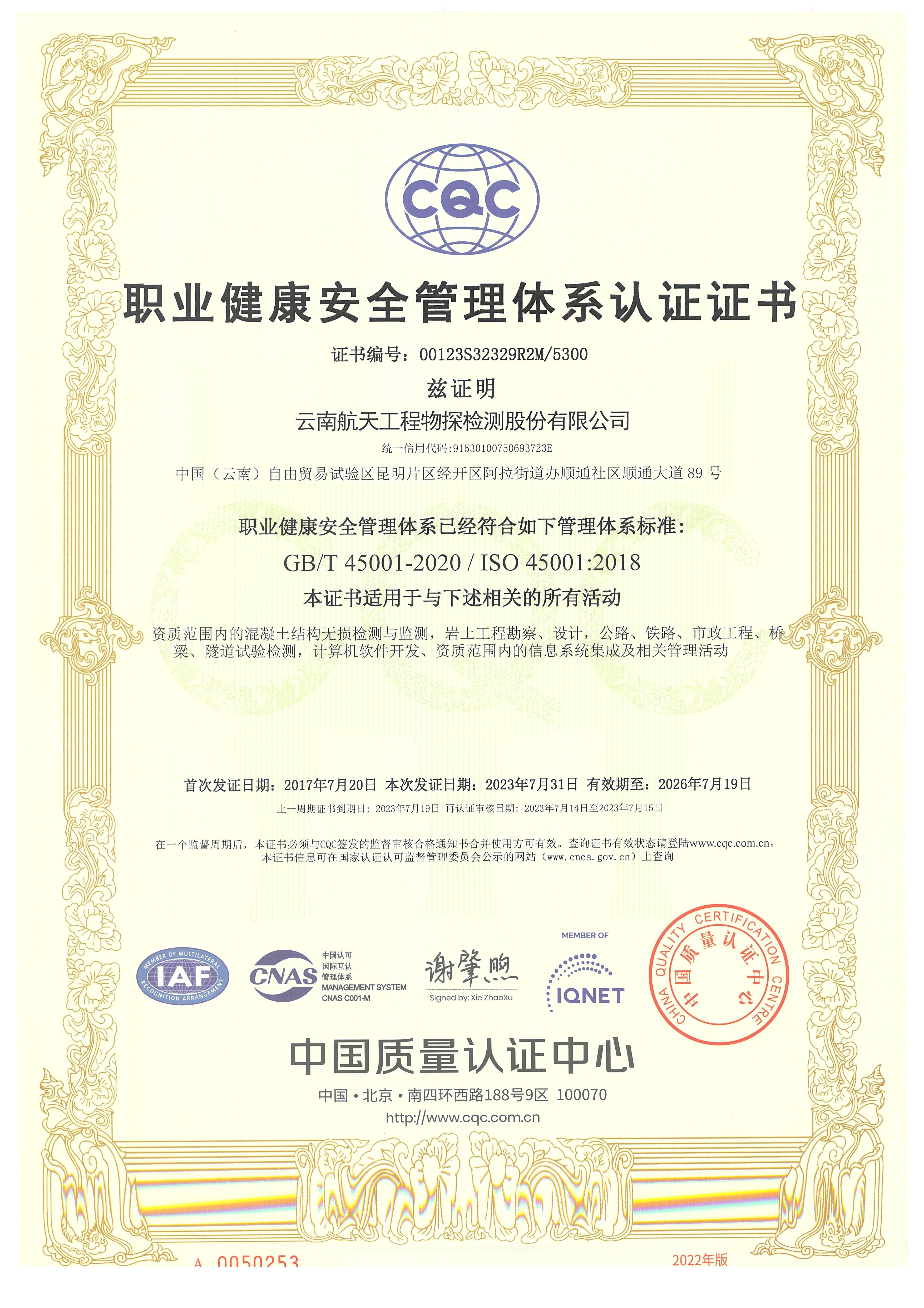 职业健康安全管理体系认证证书